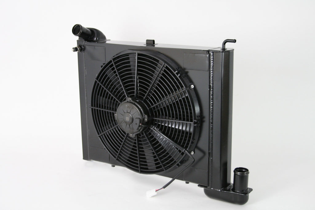This fan package includes our Direct Fit® aluminum radiator, full face aluminum shroud with six (6) rubber check valves (flaps), and a high performance 16" SPAL Fan. SPAL is a world leader in the design and manufacture of high-quality electric axial fans for automotive use. The kit comes with a wiring harness and temperature switch for fan operation.