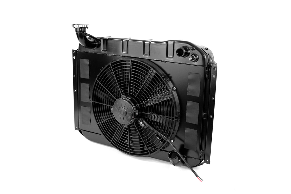 This fan package includes our Direct Fit® aluminum radiator, full face aluminum shroud with six (6) rubber check valves (flaps), and a high performance 16" SPAL Fan. SPAL is a world leader in the design and manufacture of high-quality electric axial fans for automotive use. The kit comes with a wiring harness and temperature switch for fan operation.
